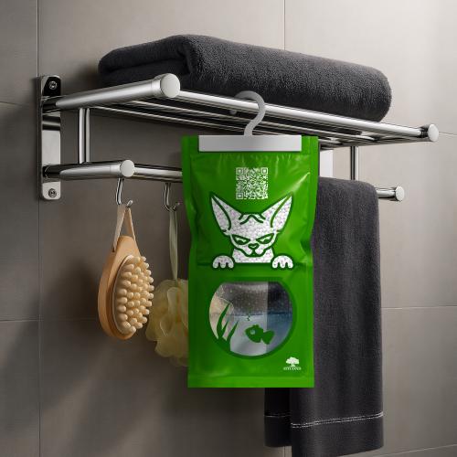 Pochłaniacz wilgoci to kompaktowy woreczek z dwoma komorami — górną i dolną, który można łatwo zawiesić za pomocą solidnego haczyka. W górnej części znajdują się kuliste granulki chlorku wapnia (CaCl₂), charakteryzujące się wysoką higroskopijnością. Dzięki dużej powierzchni aktywnej skutecznie pochłaniają wilgoć z powietrza.